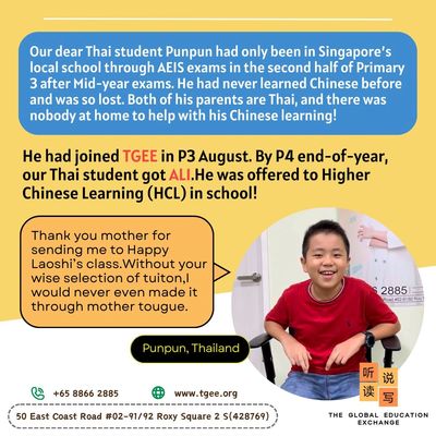An example of TGEE’s effectiveness is with one of our Thai students. He had only been in Singapore’s local school through AEIS exams in the second half of Primary 3 after Mid-year exams. He had never learned Chinese before and was so lost. Both of his parents are Thai, and there was nobody at home to help with his Chinese learning!